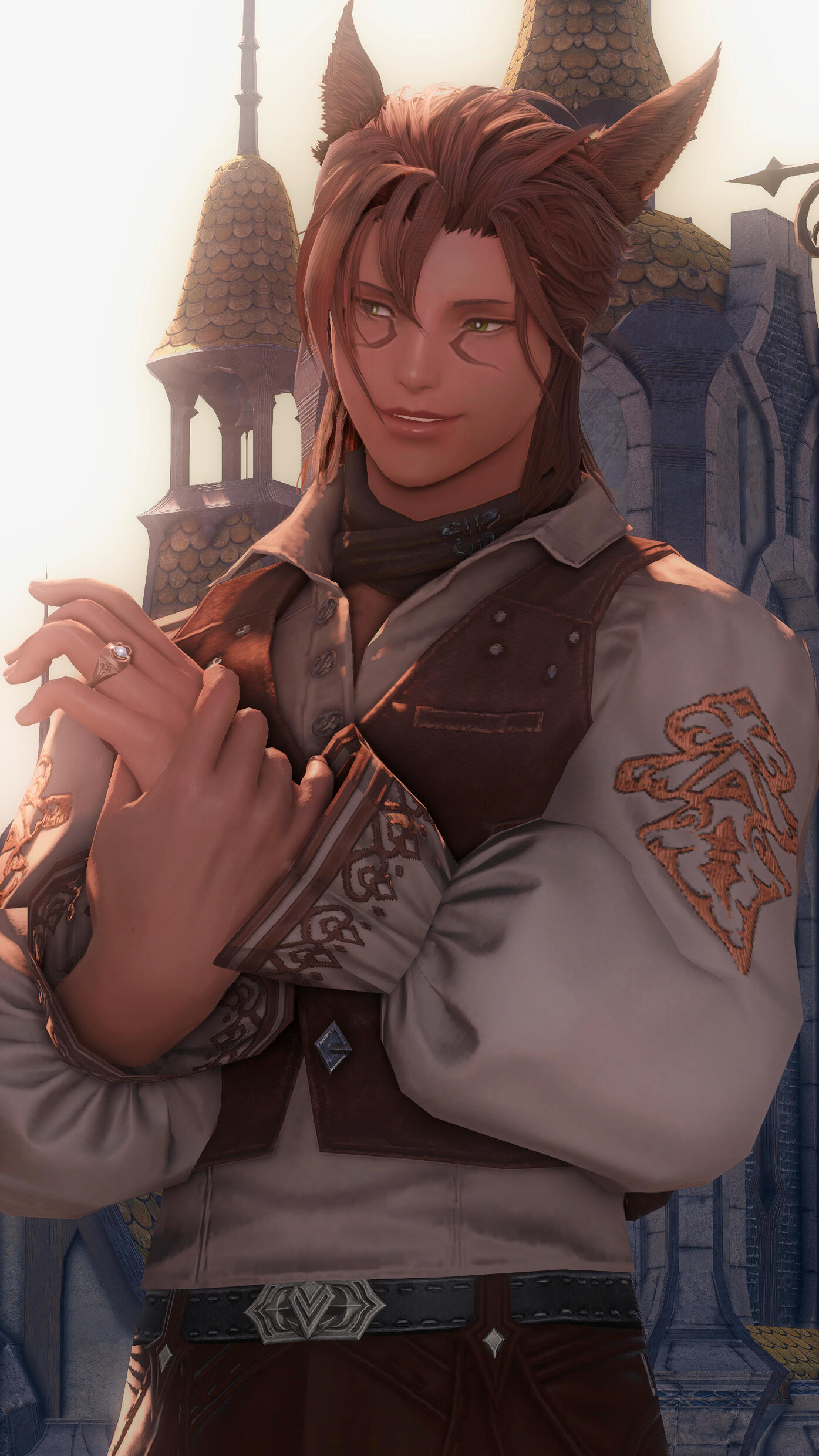 | gender- | Cis Male, He/Him | race- | Miqo'te, Keeper of the Moon/Seeker of the Sun |